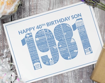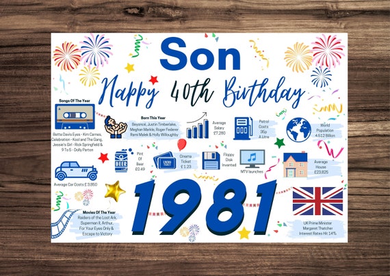 Son 40th Birthday Card Age 40 3D Metallic Foil. Happy 40th Birthday Number 40 Photo Collage Large Card. Take the receiver on a trip back 40 years and reminisce on what was happening in 1981.